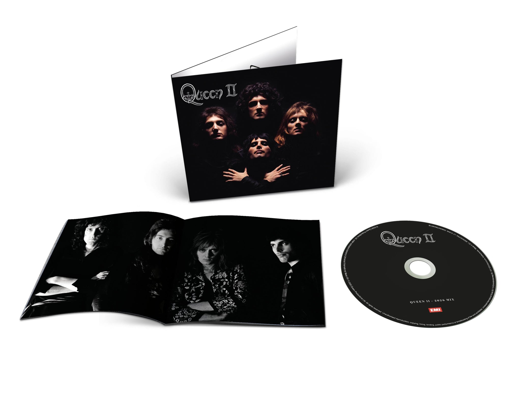 Queen II has been remixed and remastered for 2026. Available as Standard CD (2026 mix), Deluxe 2CD (expanded with sessions, demos, and more), Standard 180g Black LP (2026 mix), and a Collector’s Edition 5CD+2LP box set featuring unheard outtakes, live tracks, radio sessions, and a 112-page book with photos, handwritten lyrics, diary entries, and memorabilia. Executive producers: Brian May and Roger Taylor. Mixed by Justin Shirley-Smith, Joshua J Macrae, and Kris Fredriksson.